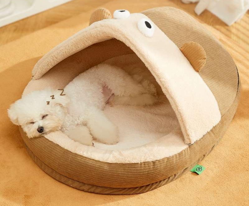 コーデュロイ調の素材を使用した小型犬のためのドーム型ベッドです。